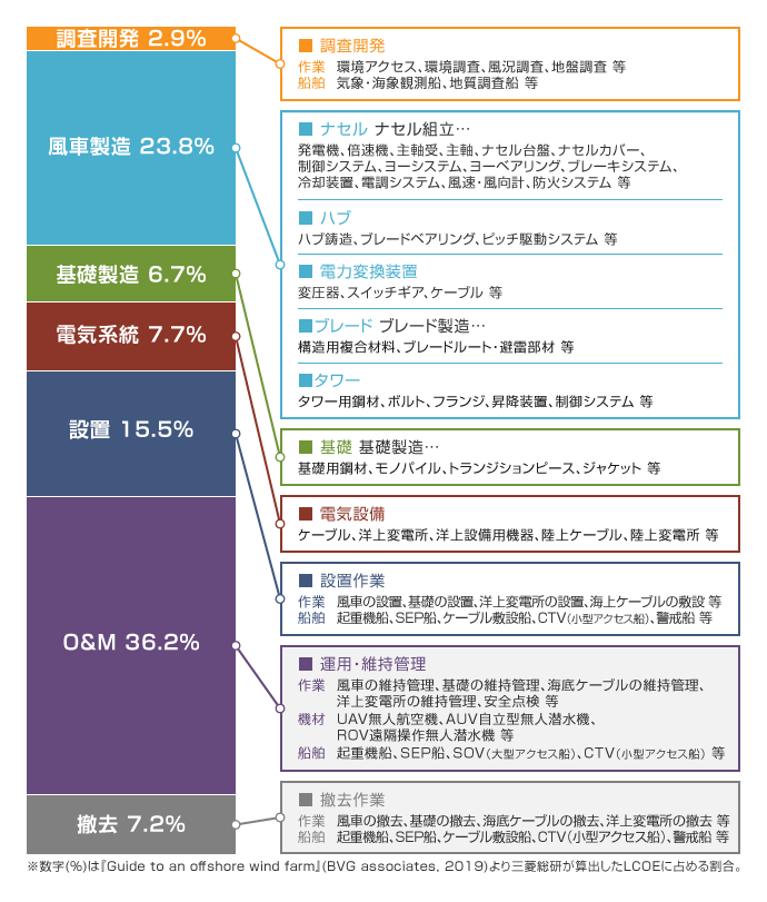 以下の図は、洋上風力発電のコスト割合を表したものですが、関連産業の広がりと、O&M(Operation&Maintenanceの略で、設備設置後の運用と保守のこと)の金額が大きいことがわかります。