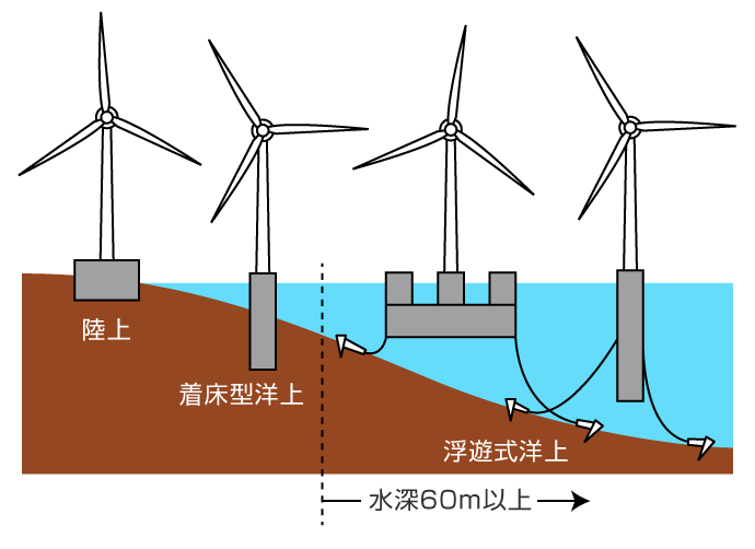 洋上風力発電では、発電設備を設置しようとする海域の水深によって、設置できるタイプが異なります。水深が50mまでなら海底面に風車の基礎を設置することが可能なため「着床式」となりますが、水深が60mを超えると海の上に風車を浮かばせる「浮体式」となります。