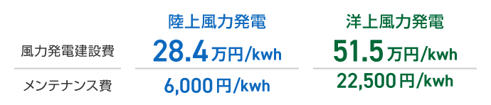 陸上風力発電コスト(19.8円/kWh)と比較すると、洋上風力発電(30.3円/kWh)は約1.5倍。特に資本費にあたる基礎工事や電力ケーブルの敷設、維持管理費は、コストを押し上げる大きな要因となっています。