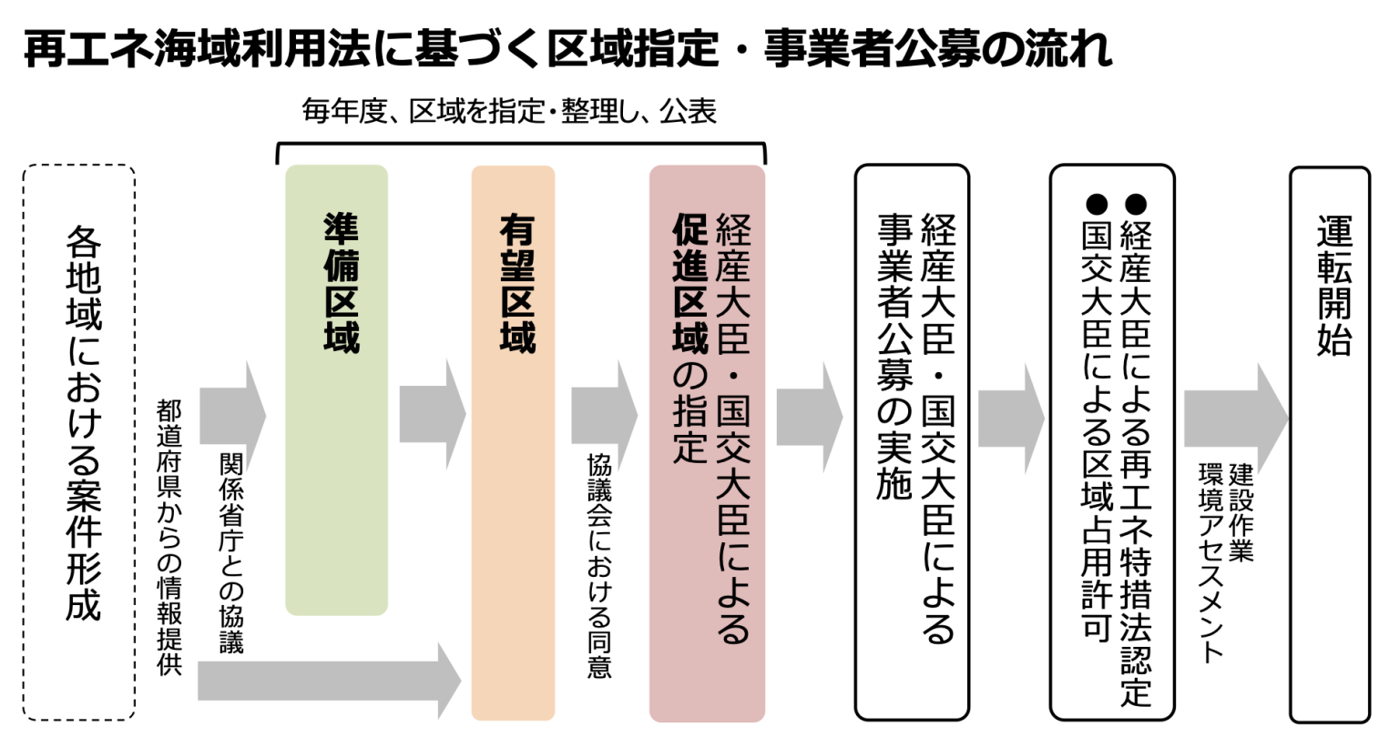洋上風力発電の環境アセスメントを行う際に、事業者が個別に案件に取り組んでいては、洋上風力全体の導入拡大が進まないため、事業者からも「もっと案件の形成初期から、政府が主体となって事業を進めてほしい」という声が聞かれるようになりました。